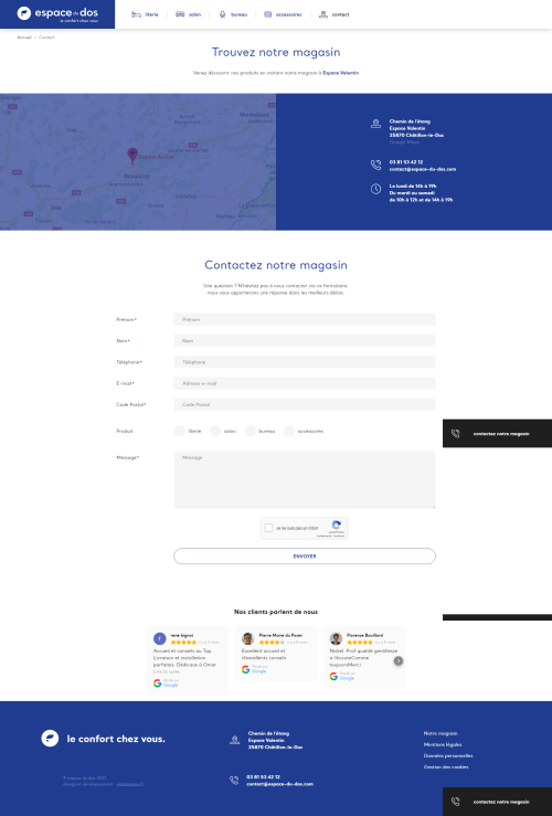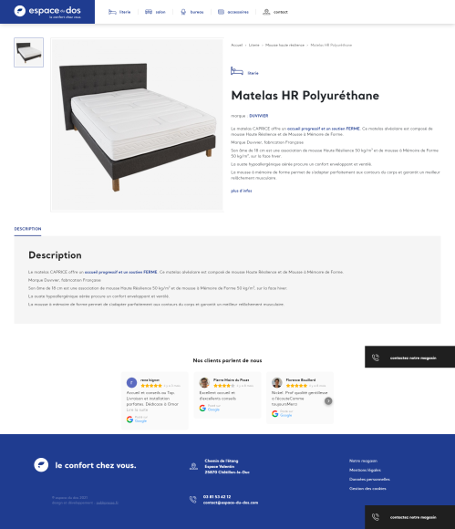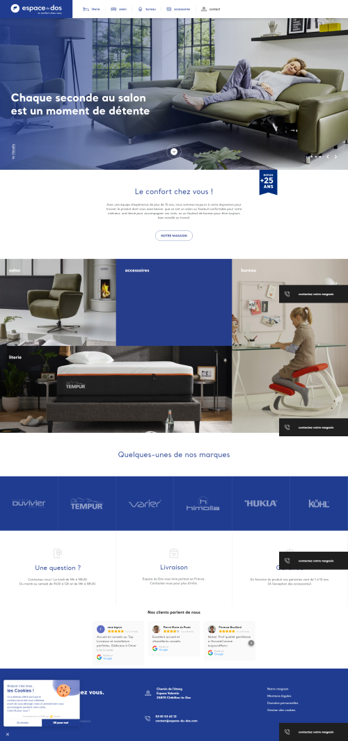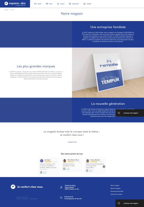 Pour l'Espace du dos, il fallait réaliser un site moderne et ergonomique, répertoriant, par catégorie, le mobilier vendu dans le magasin. Un accent particulier a été mis sur les boutons contact..