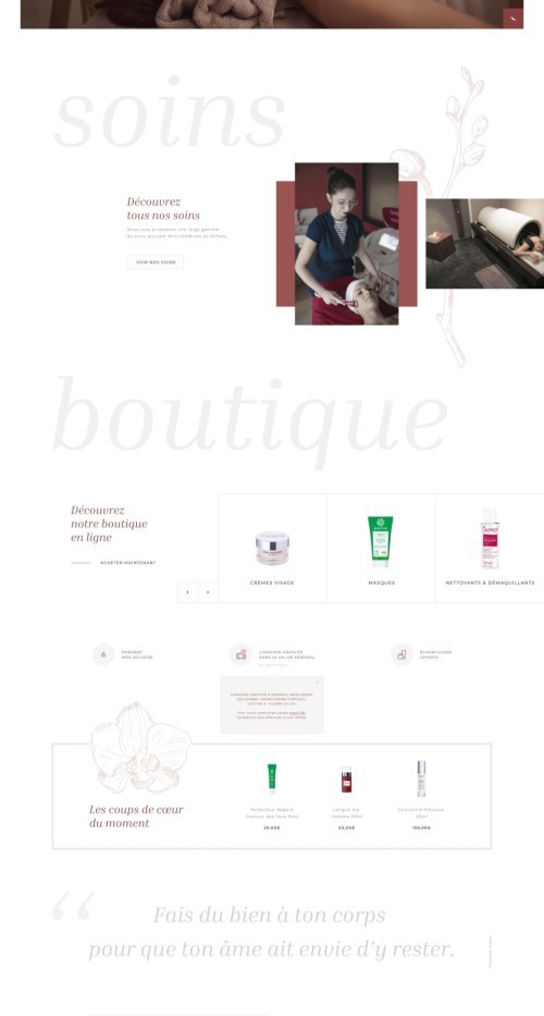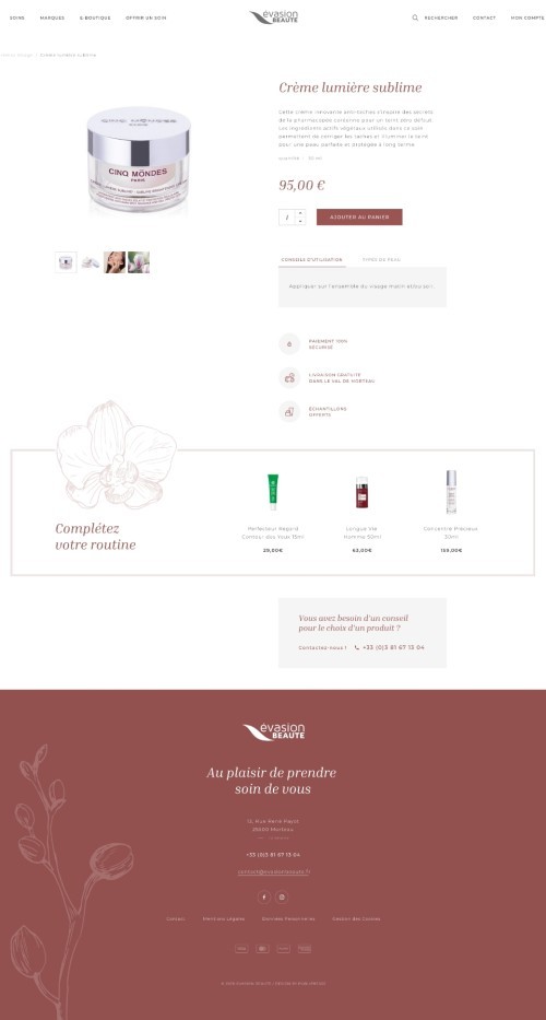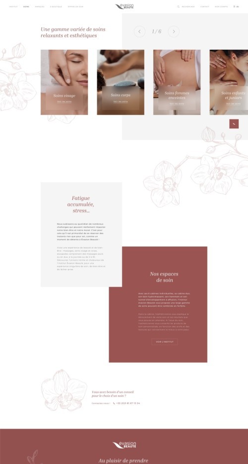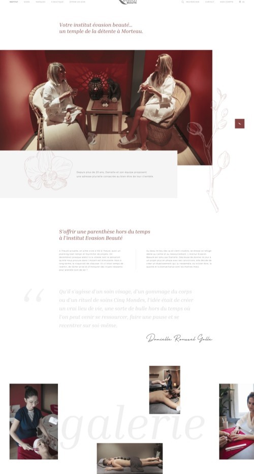 Le site Internet de l'institut Évasion beauté a la particularité de faire cohabiter deux espaces : un espace vitrine et un espace e-commerce. La présentation des services est aussi importante dans ce site Internet que les produits proposés à la vente en ligne. La conception graphique de l'ensemble est exigeante, et s'inscrit dans la continuité de ce que notre agence de communication a réalisé pour ce client en travaux d'impression.